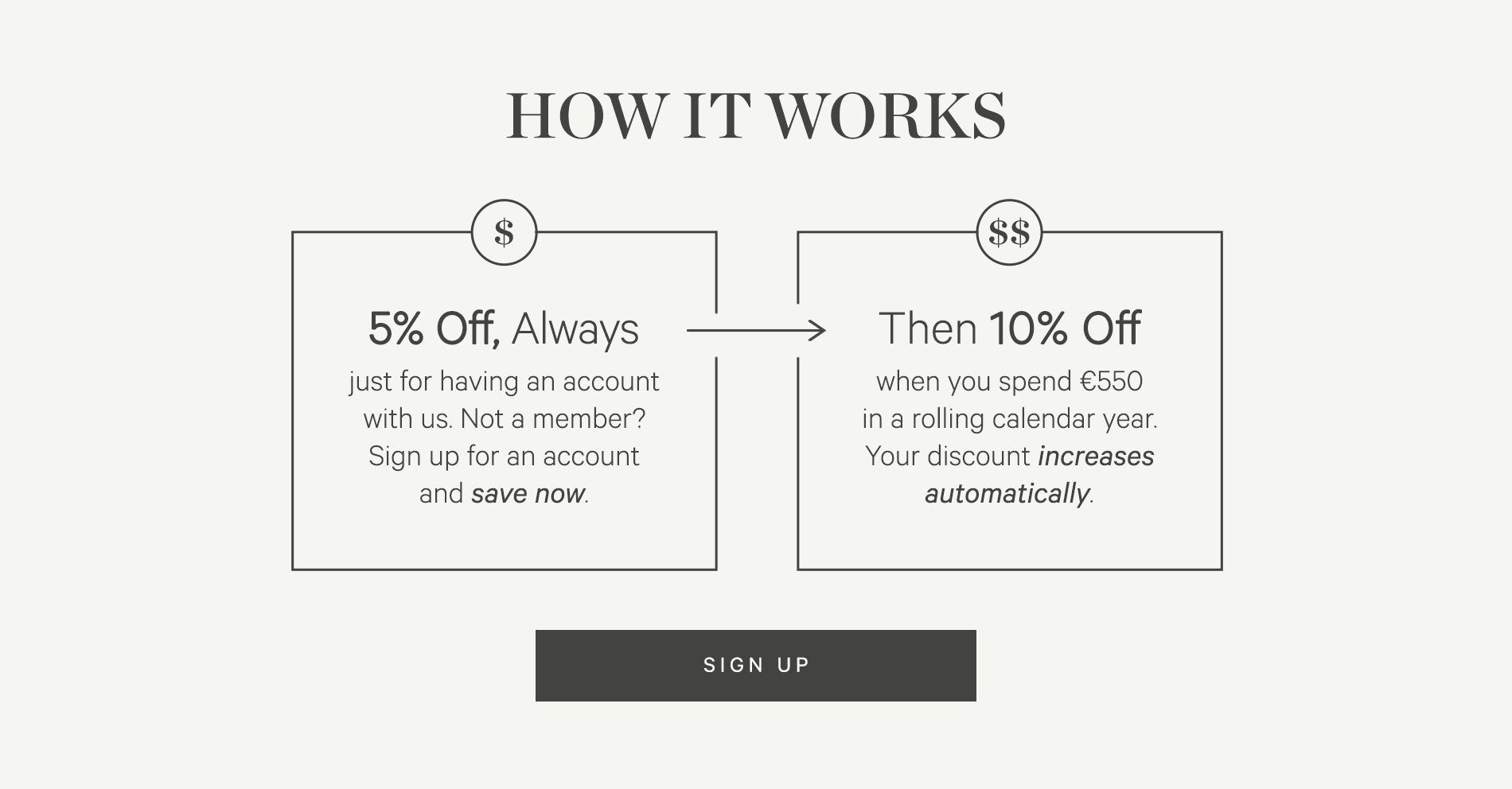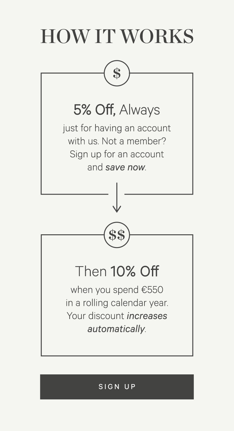 You’ll receive 5% off always when you’re logged into your account. Once you spend €550 within a rolling calendar year, your discount automatically increases to 10% off for the next calendar year. Your discount will be automatically applied at checkout, to make things easy for you.